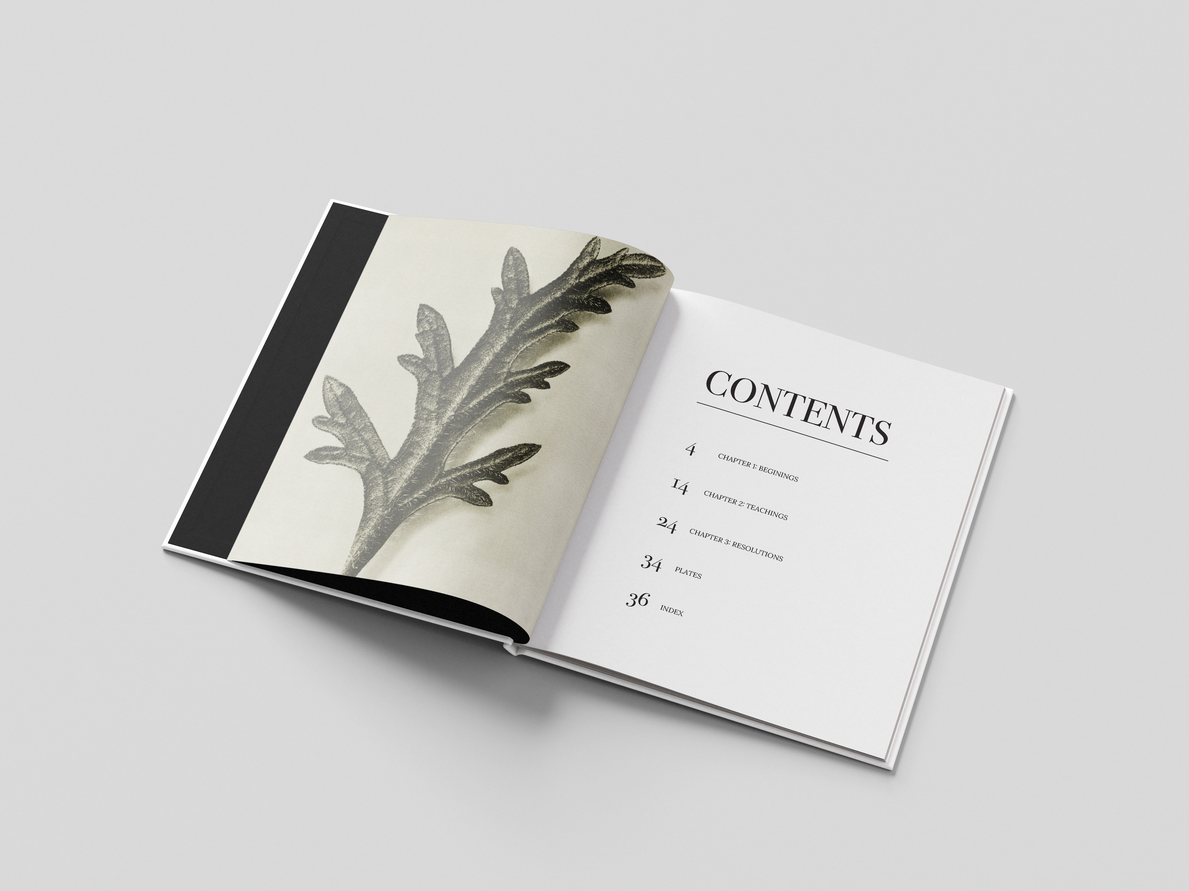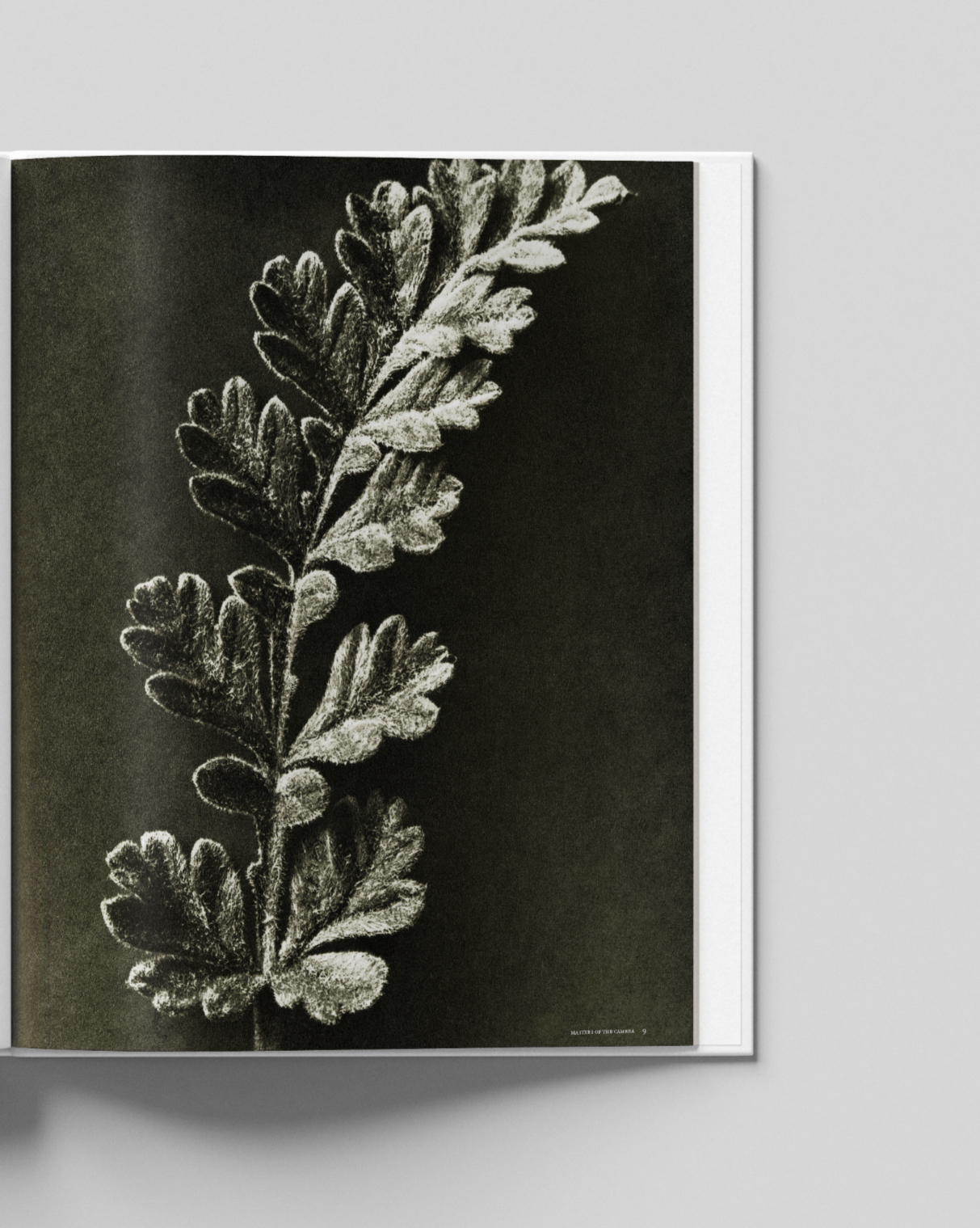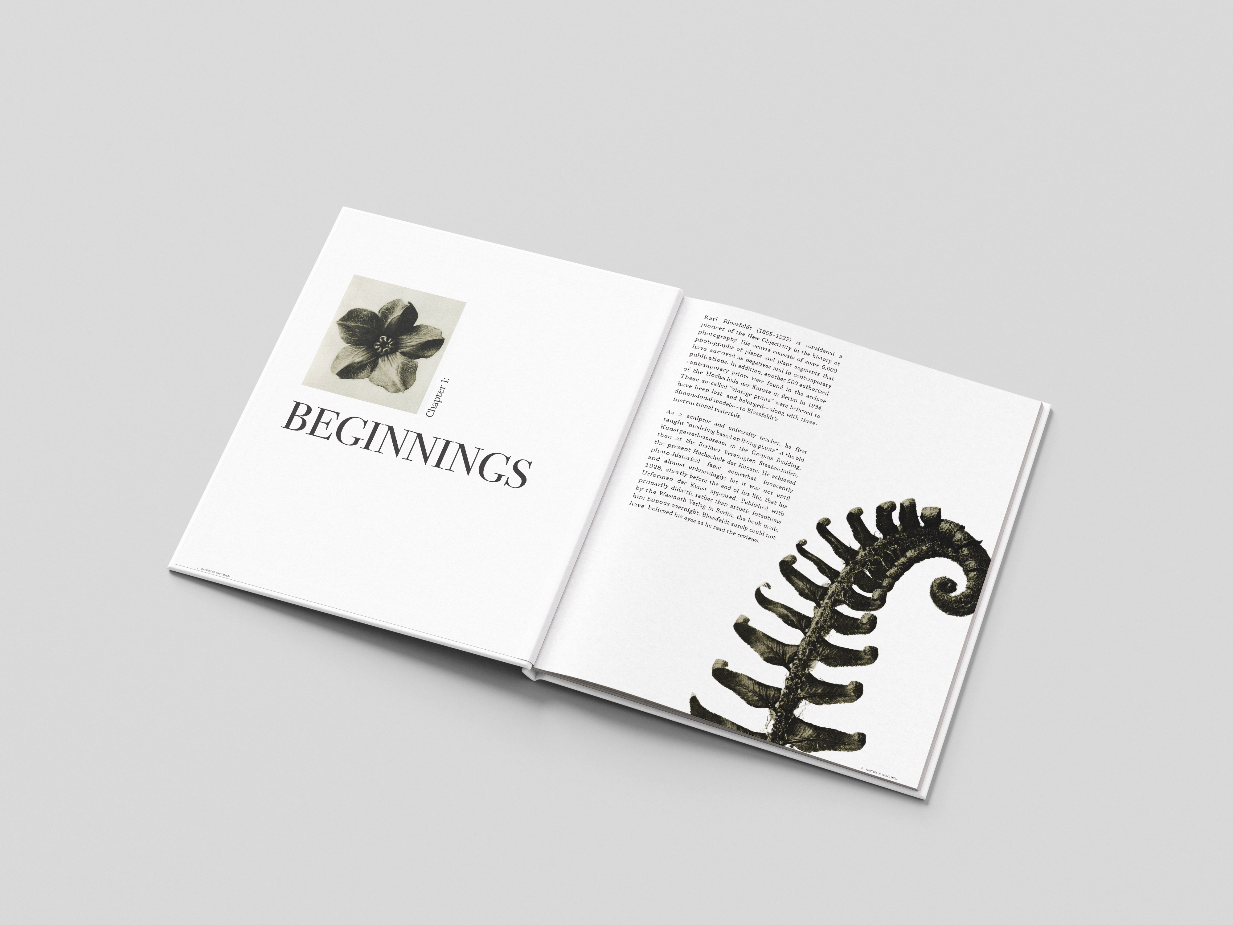 My approach focused on restraint, letting the photographs remain the focal point. I used a limited color palette to preserve their natural depth and texture, and a clean serif typeface to reflect the timeless precision of the work. Certain images were given full-page spreads to highlight their intricate forms, with ample negative space to allow viewers to pause and study the details. Overall, the design emphasizes simplicity, balance, and respect for Blossfeldt’s craftsmanship.